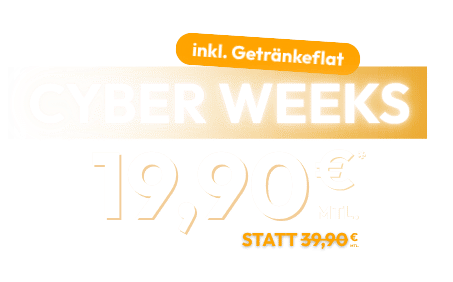 * Aktions-Mitgliedschaft CYBER WEEKS 12: Mindestvertragslaufzeit 12 Monate. In den ersten 3 Monaten beträgt der monatliche Mitgliedsbeitrag je 19,90 € (statt 34,90 €), ab dem 4. Monat erhöht er sich auf je 34,90 € monatlich. Wird der Vertrag nicht spätestens einen Monat vor Ablauf der Mindestvertragslaufzeit gekündigt, verlängert er sich auf unbestimmte Zeit und kann mit einer Frist von 1 Monat jederzeit gekündigt werden. Membercard einmalig 29,90 €. In den ersten 3 Monaten erhält das Mitglied außerdem die Getränkeflat (Wert: 5 €/mtl.) gratis. Der Gesamtpreis für die Mindestvertragslaufzeit beträgt somit 403,70 €. Alle Preise inkl. gesetzlicher MwSt.