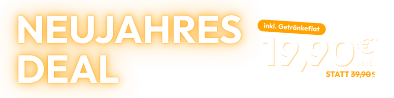 Mit dem NEUJAHRES DEAL schließt du eine Mitgliedschaft mit 12 Monaten Mindestlaufzeit ab und trainierst die ersten 3 Monate für 19,90 € mtl. Die Getränkeflat erhältst du ebenfalls während dieser 3 Monate gratis. Ab dem 4. Monat zahlst du 34,90 € mtl. Möchtest du dann weiterhin die Getränkeflatrate nutzen, zahlst du +5 € mtl.