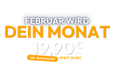 Mit dem FEBRUAR DEAL schließt du eine Mitgliedschaft mit 12 Monaten Mindestlaufzeit ab und trainierst die ersten 3 Monate für 19,90 € mtl. Die Getränkeflat erhältst du ebenfalls während dieser 3 Monate gratis. Ab dem 4. Monat zahlst du 34,90 € mtl. Möchtest du dann weiterhin die Getränkeflatrate nutzen, zahlst du +5 € mtl.