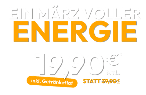 Mit dem MÄRZ DEAL schließt du eine Mitgliedschaft mit 12 Monaten Mindestlaufzeit ab und trainierst die ersten 3 Monate für 19,90 € mtl. Die Getränkeflat erhältst du ebenfalls während dieser 3 Monate gratis. Ab dem 4. Monat zahlst du 34,90 € mtl. Möchtest du dann weiterhin die Getränkeflatrate nutzen, zahlst du +5 € mtl.